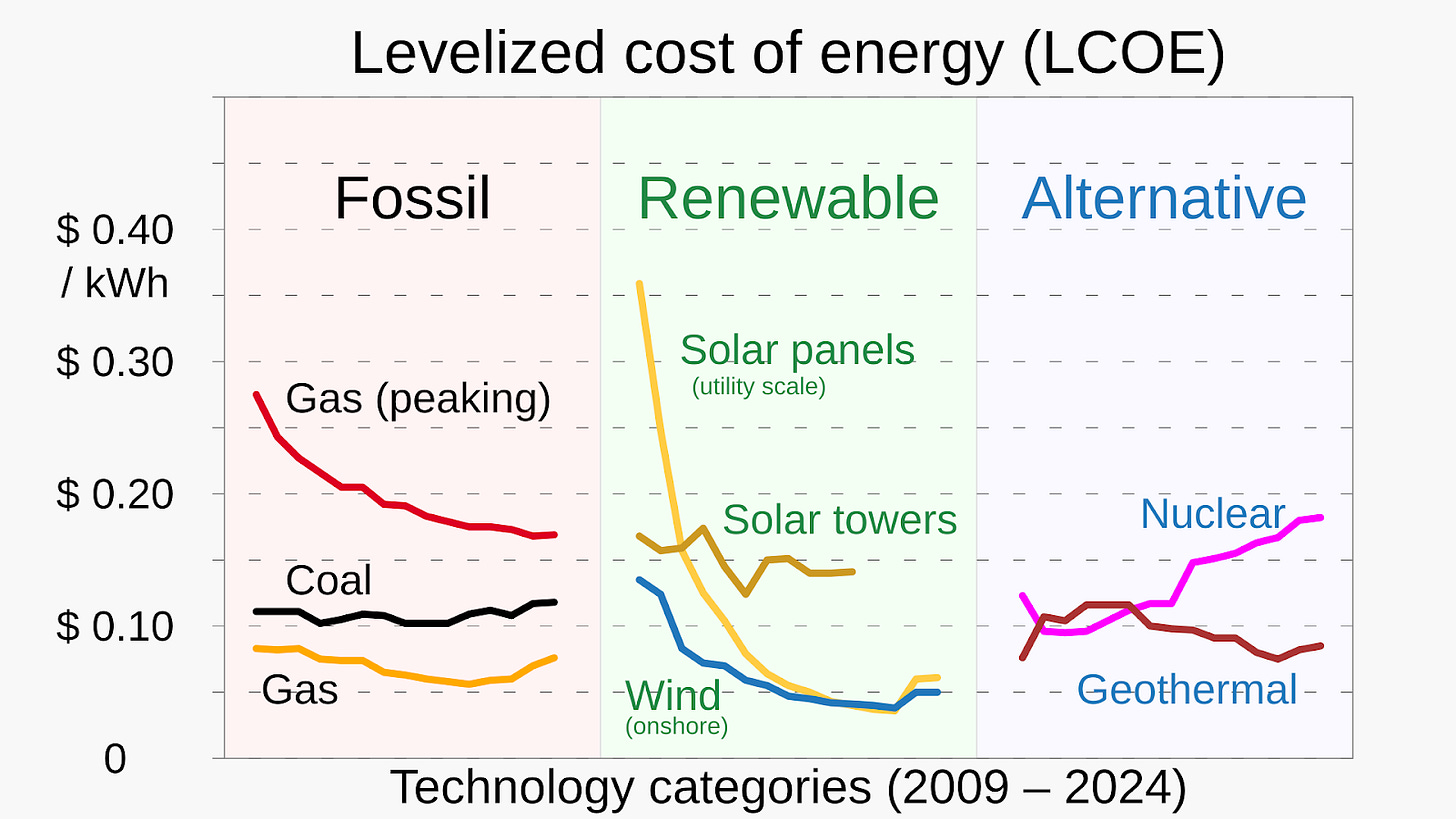 There are many forms of generation, each with different grid effects and economics. Right now, in most of the US, renewables, specifically solar, are the cheapest way to generate electricity. Given solar’s obvious time dynamics, pairing with batteries for the ability to extend production hours is key. Other technologies such as coal, gas, and nuclear are considered ‘dispatchable’ - meaning you can turn them on and off as you wish. This is a great feature of a power generator, although it comes at a cost. The cost of coal and nat gas is essentially the cost of the input fuel, whereas the major cost of nuclear is the up front investment (uranium is cheap as a fuel compared to its power output). So, rational economic actors - without market manipulation from the government - will tend to deploy solar alongside batteries to produce electricity.